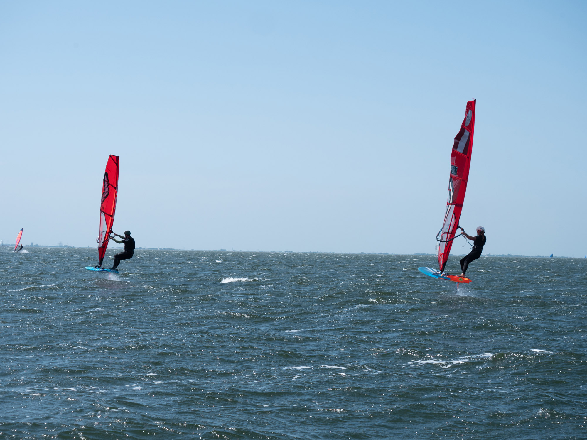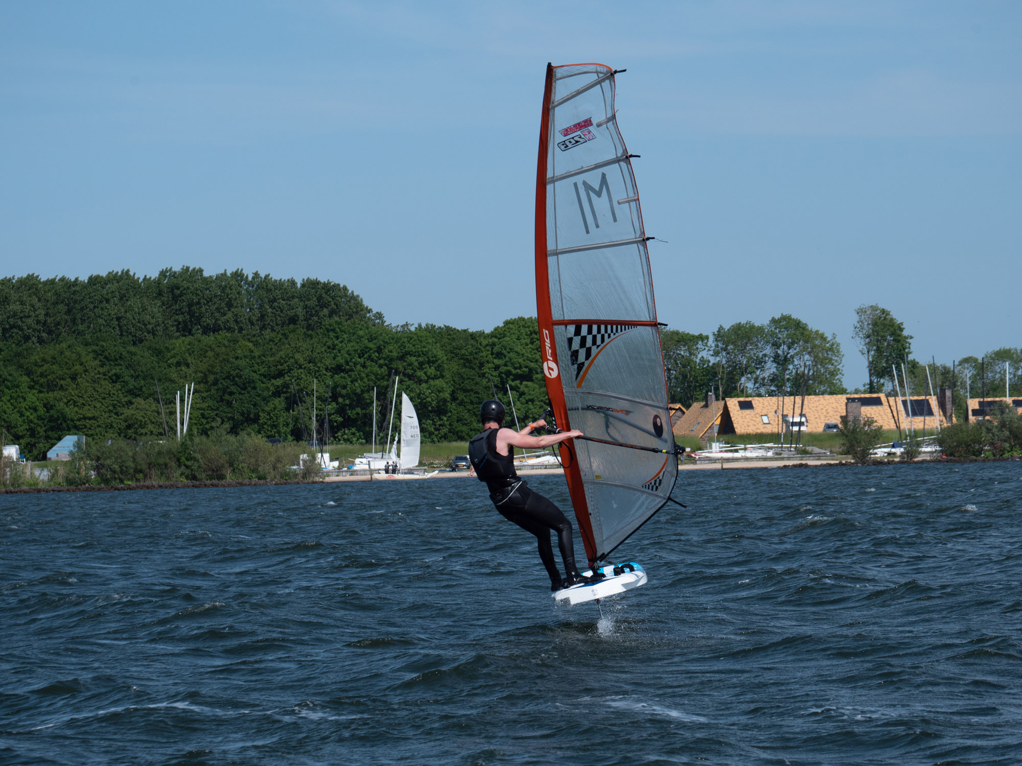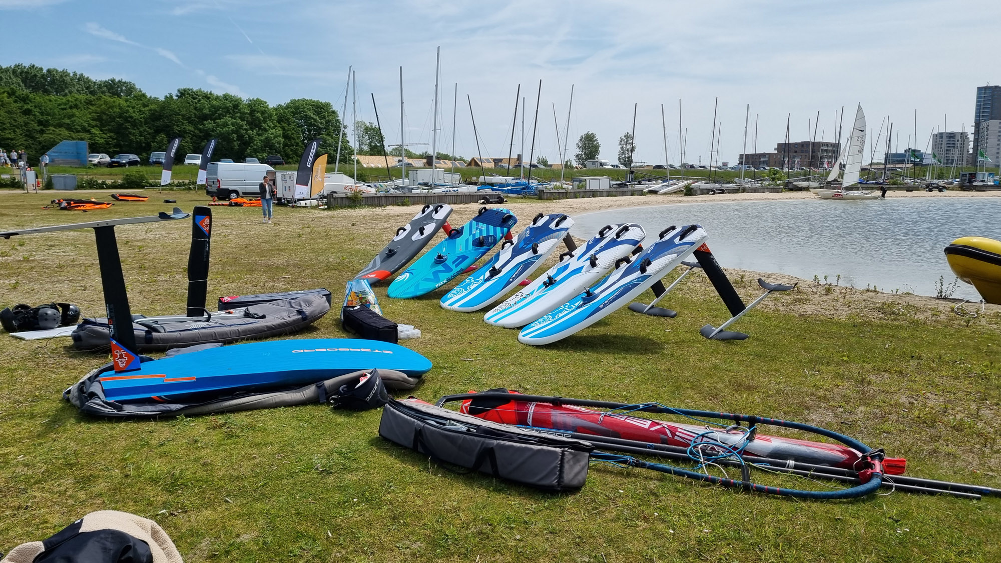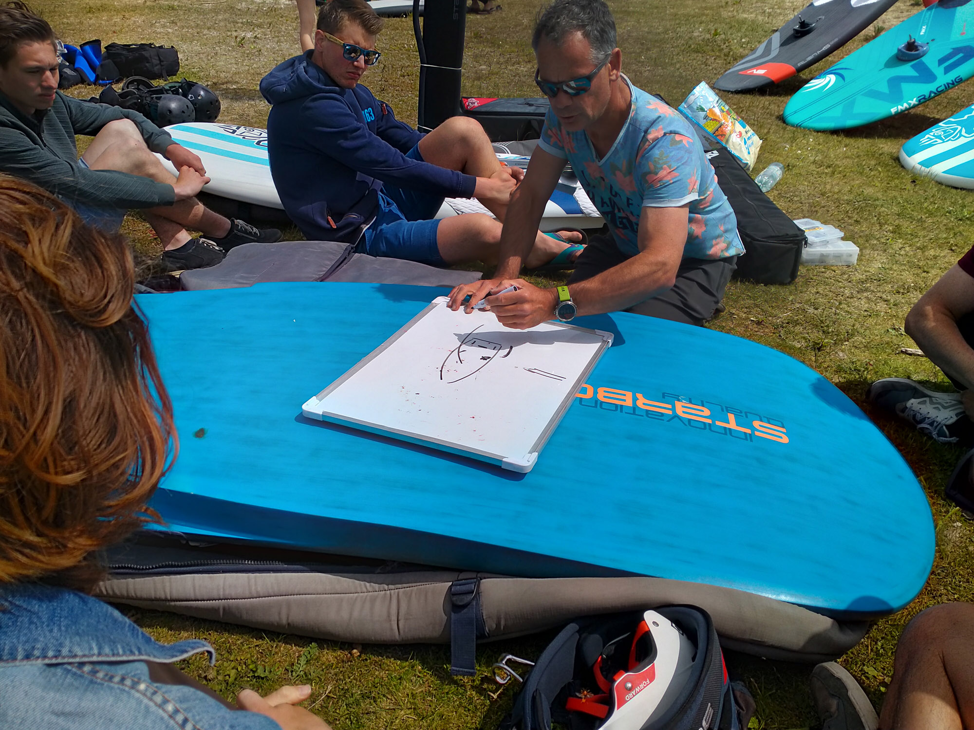 Marco heeft een assortiment foils van Starboard, Severne en FMX Racing voor ons meegenomen. We starten met een uitgebreide theorie over de foilboards, foils en zeilen. Vooral gericht op wat wij als clubmateriaal aan willen gaan schaffen. We leren dat we onze windsurfhouding voor het foilen overboord moeten gaan gooien. Het zwaartepunt ligt namelijk niet meer achterop je board bij de vin, maar meer naar voren onder de front wing van je foil. Je draait daarbij je lichaam na het opstijgen direct meer open naar voren i.p.v. het trapeze inhaken en naar achteren hangen. Met deze info konden we vervolgens het water op en de lucht in. Het was voor veel van onze trainers een geslaagde kennismaking met het windfoilen. De basis is gelegd om de trainers op te leiden tot foilinstructeurs en deze mooie sport over een tijdje aan te kunnen bieden aan onze cursisten.