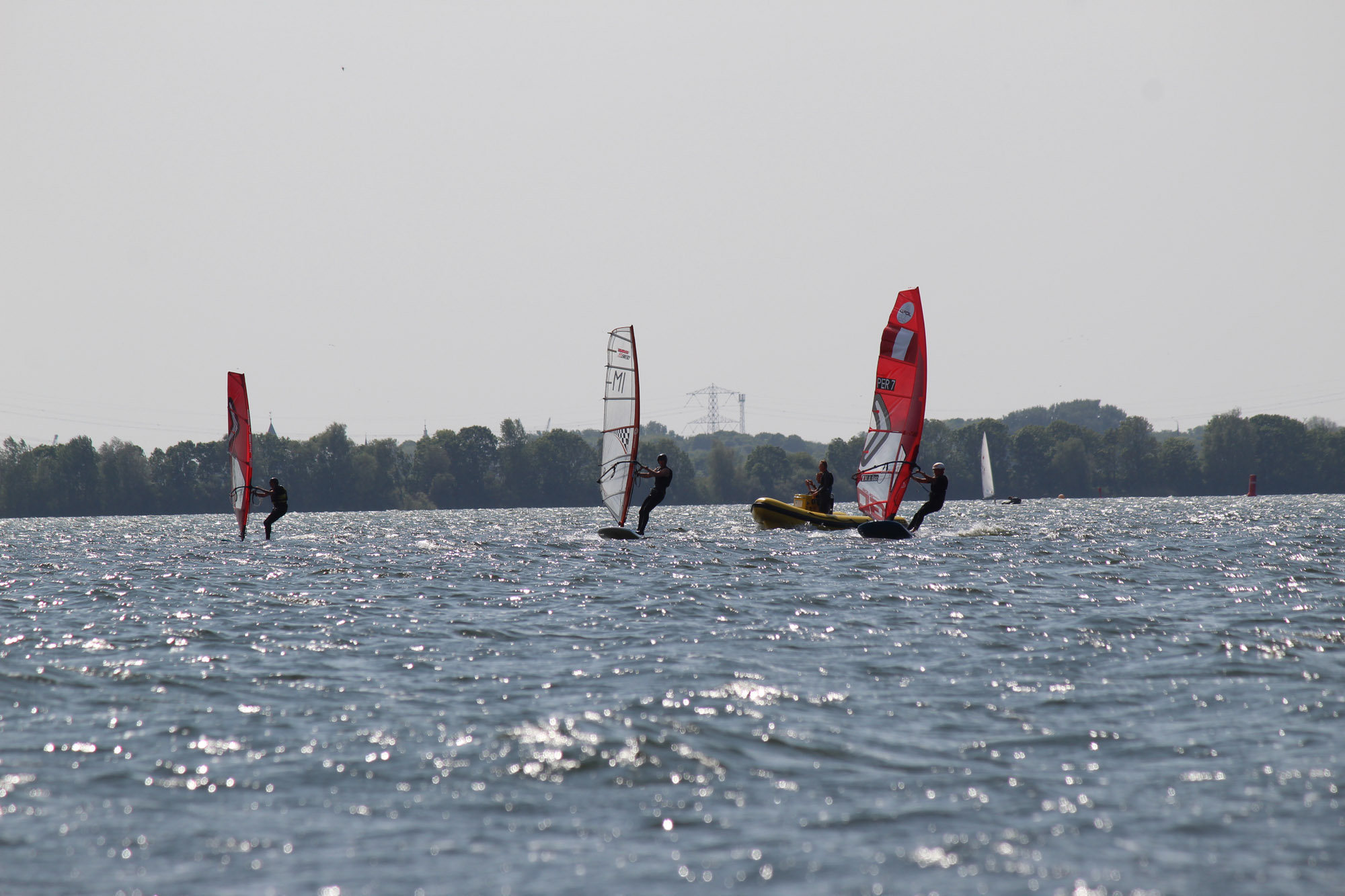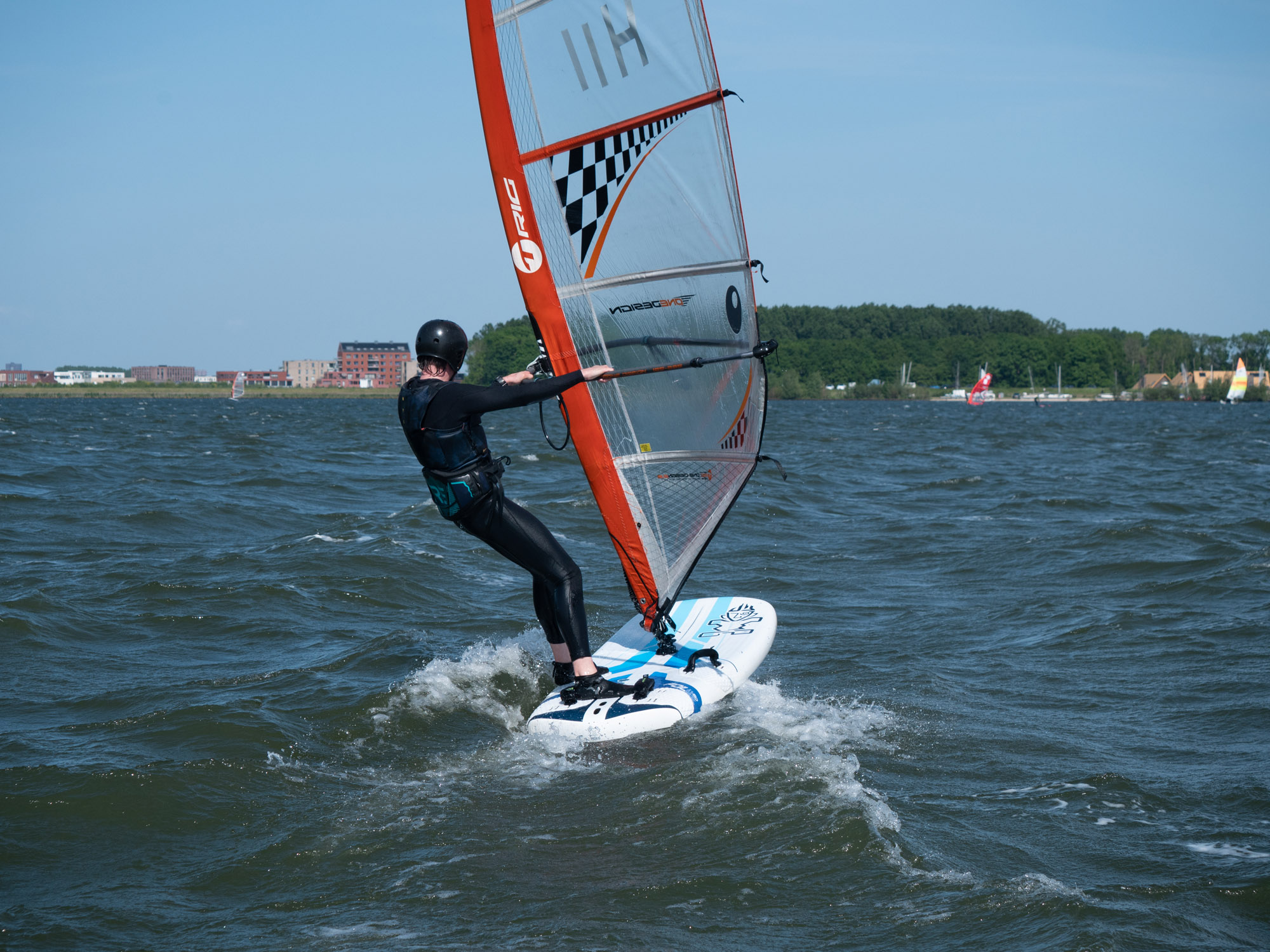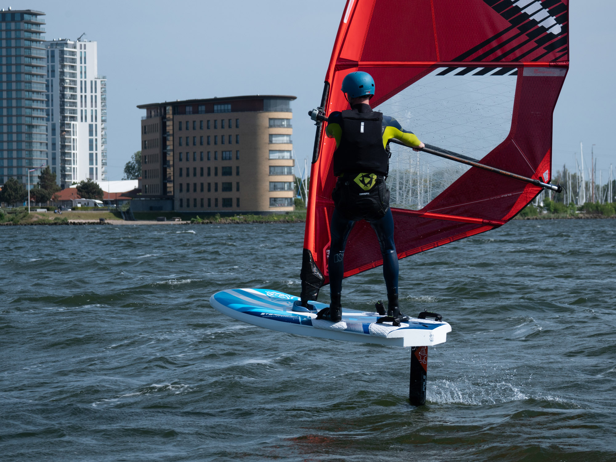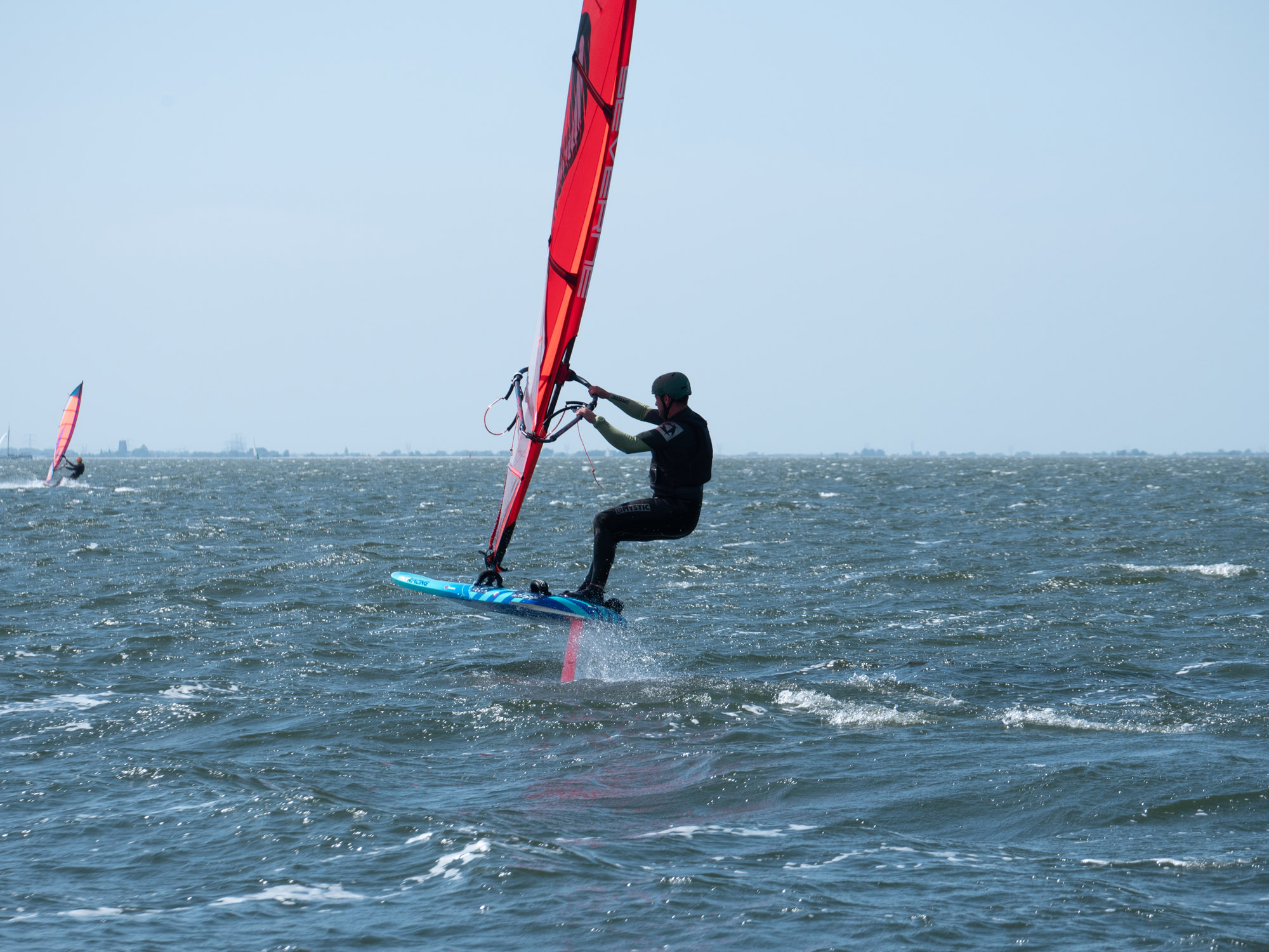 Marco heeft een assortiment foils van Starboard, Severne en FMX Racing voor ons meegenomen. We starten met een uitgebreide theorie over de foilboards, foils en zeilen. Vooral gericht op wat wij als clubmateriaal aan willen gaan schaffen. We leren dat we onze windsurfhouding voor het foilen overboord moeten gaan gooien. Het zwaartepunt ligt namelijk niet meer achterop je board bij de vin, maar meer naar voren onder de front wing van je foil. Je draait daarbij je lichaam na het opstijgen direct meer open naar voren i.p.v. het trapeze inhaken en naar achteren hangen. Met deze info konden we vervolgens het water op en de lucht in. Het was voor veel van onze trainers een geslaagde kennismaking met het windfoilen. De basis is gelegd om de trainers op te leiden tot foilinstructeurs en deze mooie sport over een tijdje aan te kunnen bieden aan onze cursisten.